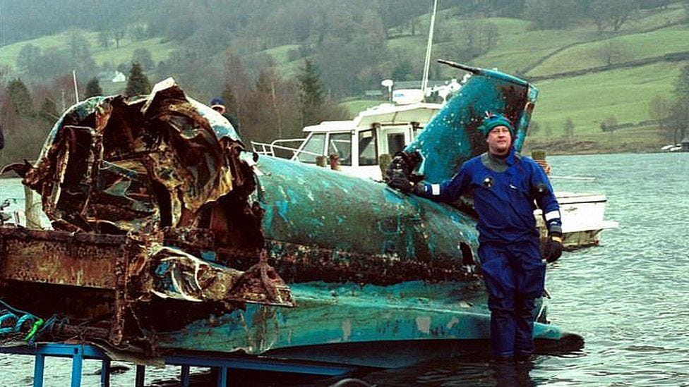 8-MAR-2001: The wreckage of Donald Campbell’s Bluebird was raised from Coniston Water in the English Lakes.