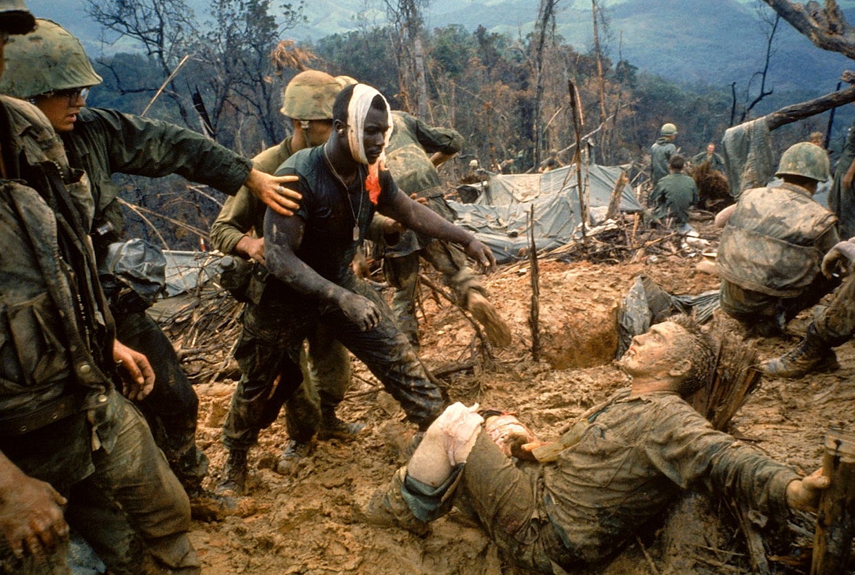 Surely, the Vietnam War represents the zenith of combat photography: the authorities allowed them much leeway, there was an unspoken agreement that the soldiers had no obligation to defend them, but the photographers would help the wounded. They seldom manufactured situations and would not exploit their subjects; they took fine, honest photographs, put themselves in harm’s way to get them and somehow managed to maintain their humanity.