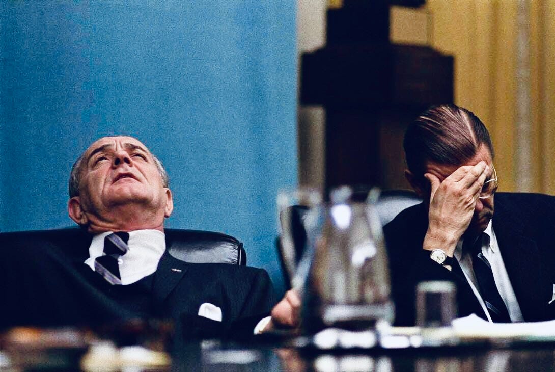 On 31st March, just seven weeks after the above photograph was taken, Johnson announced two things: firstly, a change in war strategy; and secondly, that he would not seek re-election as president. McNamara had already announced his departure.